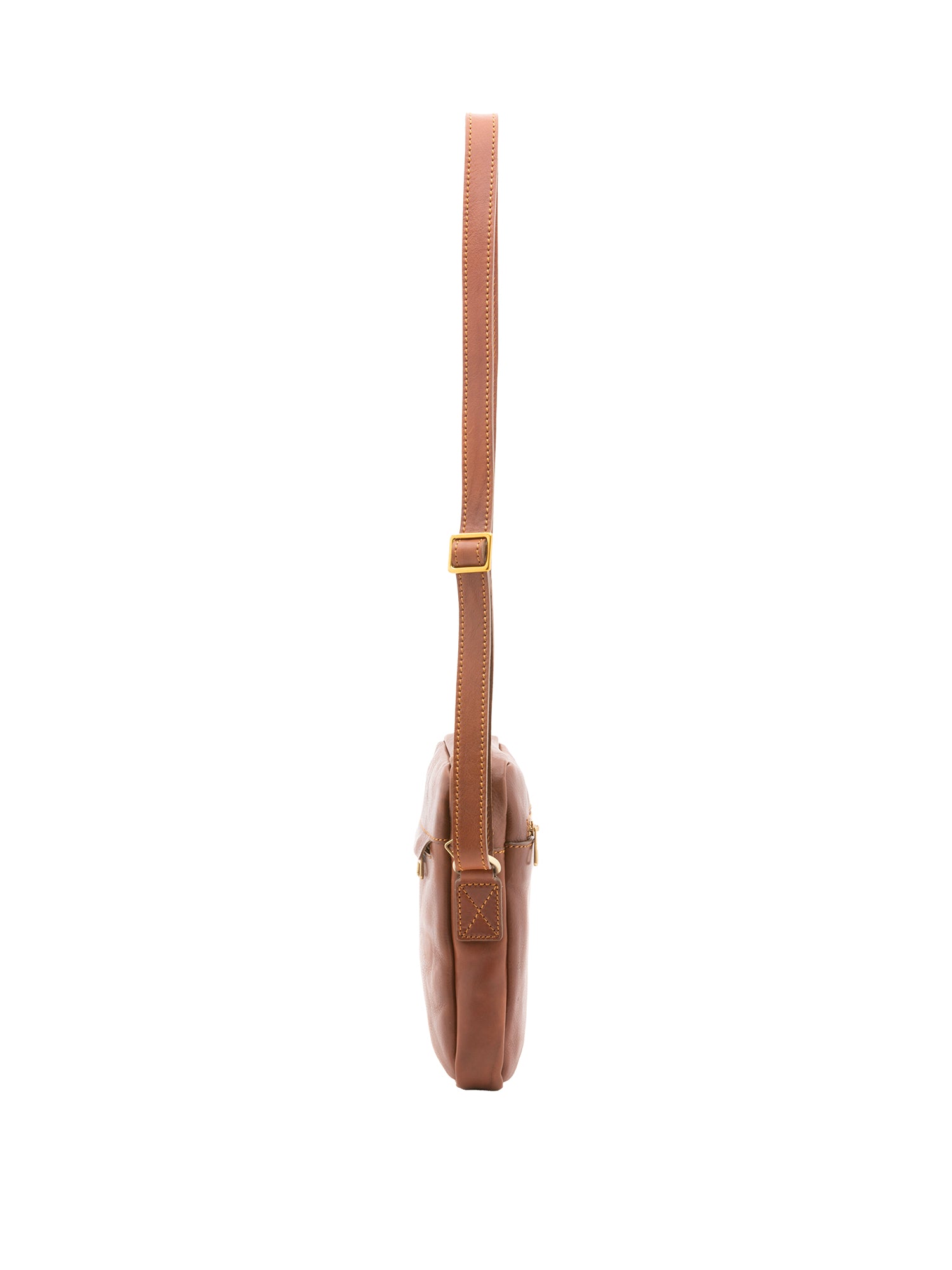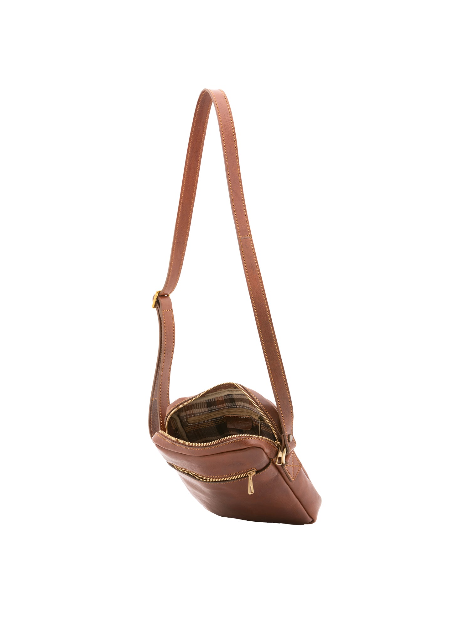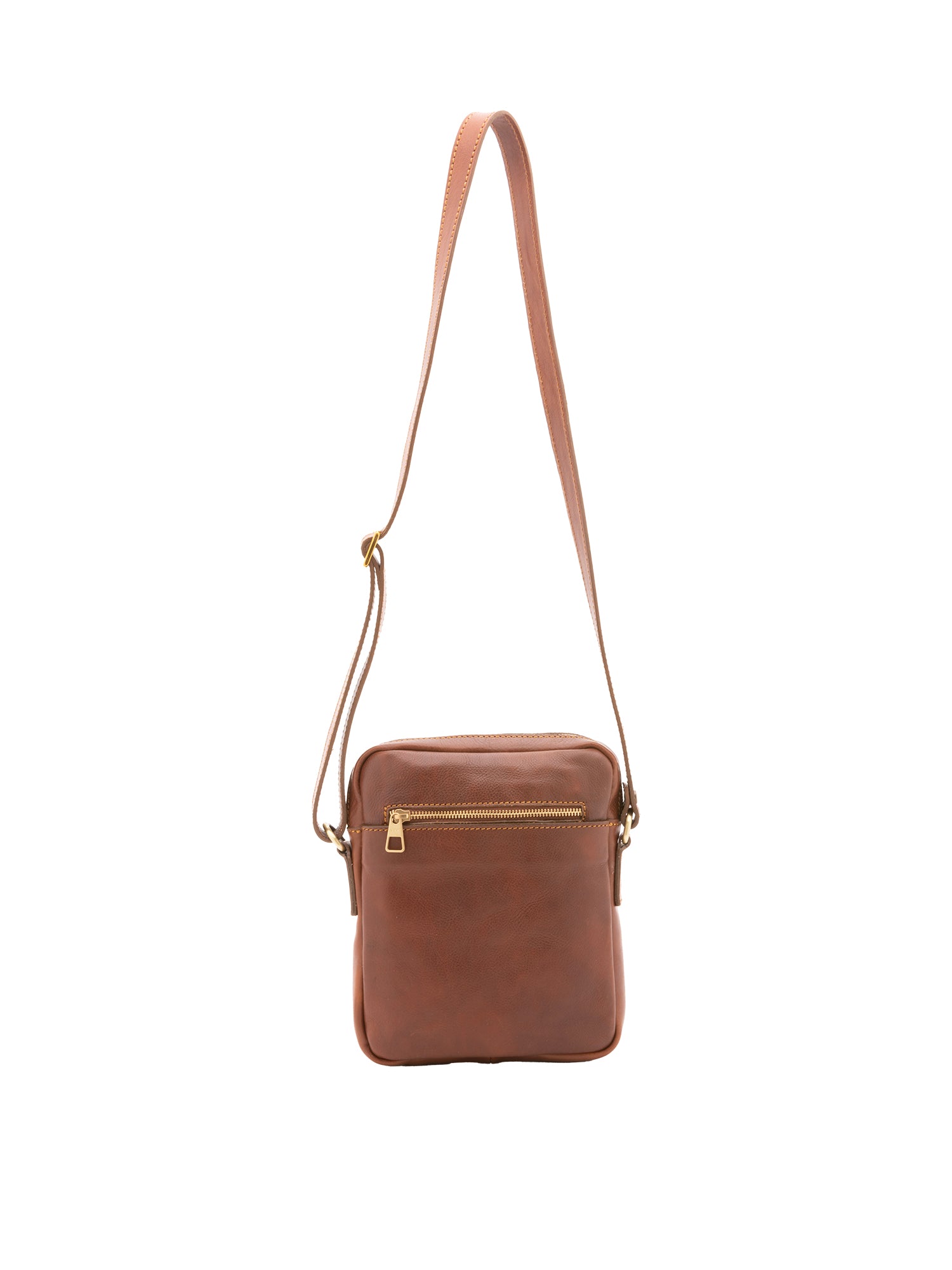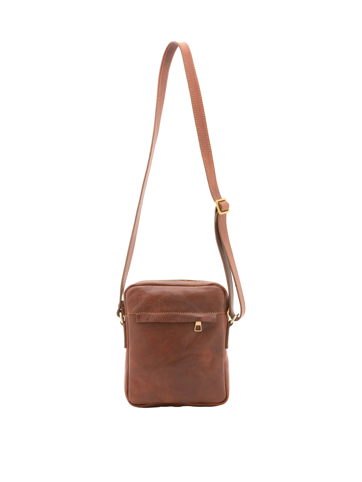 Sac bandoulière pour homme. La fermeture est à zip. Les poches intérieures sont une avec un zip. Les poches extérieures sont une poche avant zippée et une poche arrière zippée. La bandoulière est réglable en cuir. La poignée est manquante. Il y a un compartiment interne. Le matériau extérieur est 100 % cuir véritable. L'intérieur est doublé en coton. Dimensions : 24x20x4 cm. Fabriqué en Italie