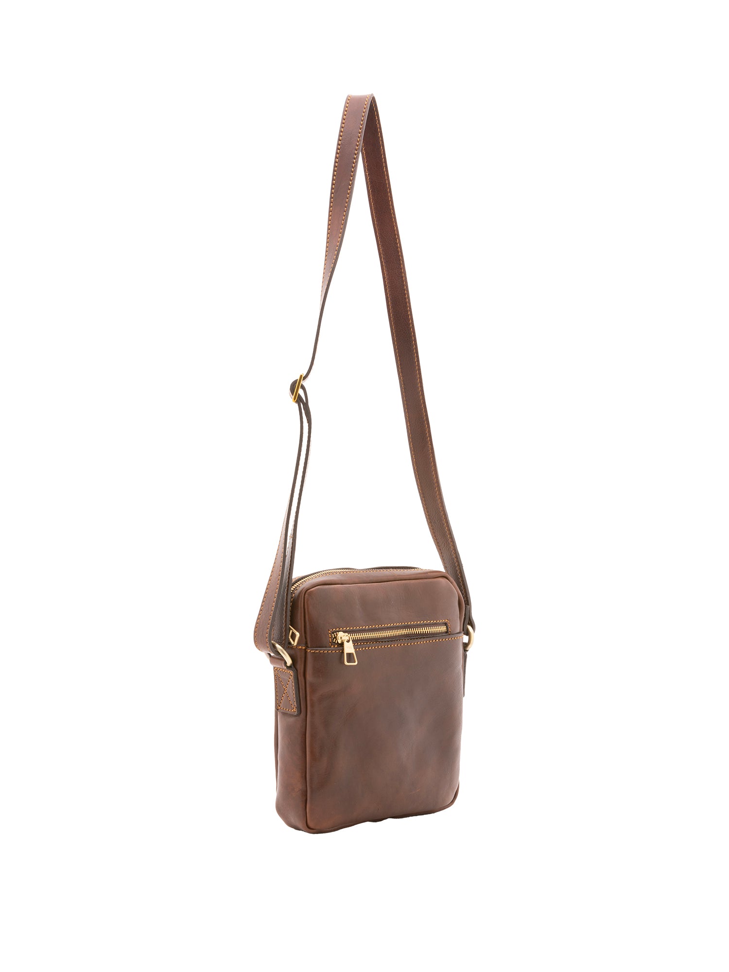 Sac bandoulière pour homme. La fermeture est à zip. Les poches intérieures sont une avec un zip. Les poches extérieures sont une poche avant zippée et une poche arrière zippée. La bandoulière est réglable en cuir. La poignée est manquante. Il y a un compartiment interne. Le matériau extérieur est 100 % cuir véritable. L'intérieur est doublé en coton. Dimensions : 24x20x4 cm. Fabriqué en Italie