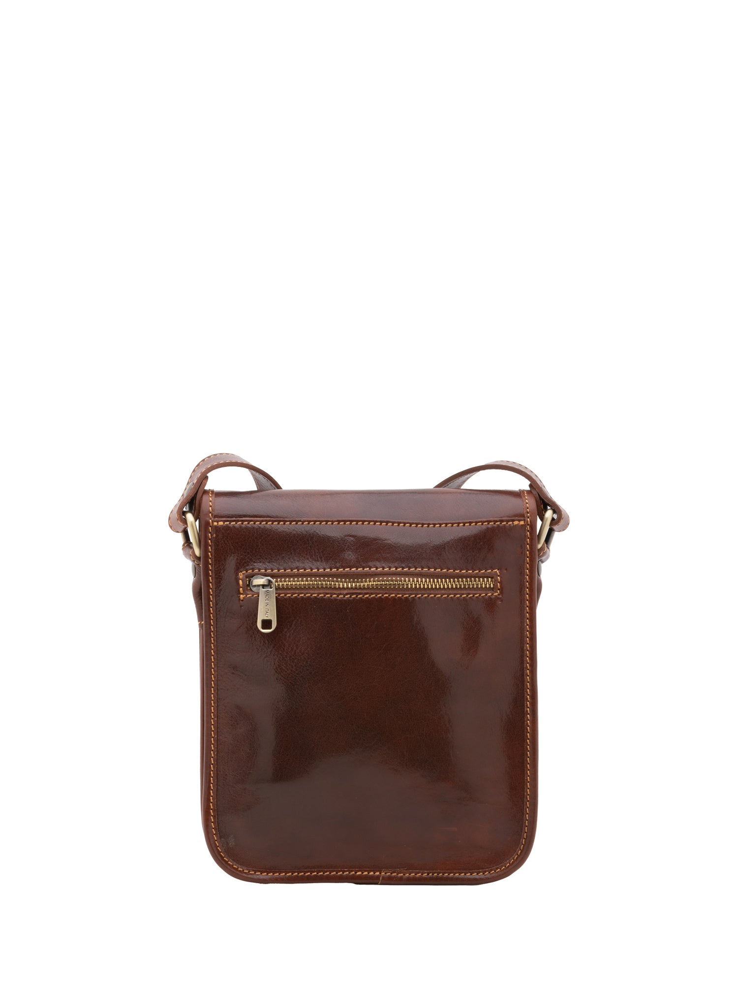 Borsa a tracolla da uomo. La chiusura è con calamita. Le tasche interne sono una con zip. Le tasche esterne sono una anteriore con aperta e una posteriore con zip. La tracolla è regolabile in pelle. Il manico è assente. Gli scomparti interni sono due. Il materiale esterno è vera pelle vacchetta. Internamente è foderato in cotone. Misure: 23x20x9 cm . Made in Italy