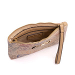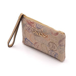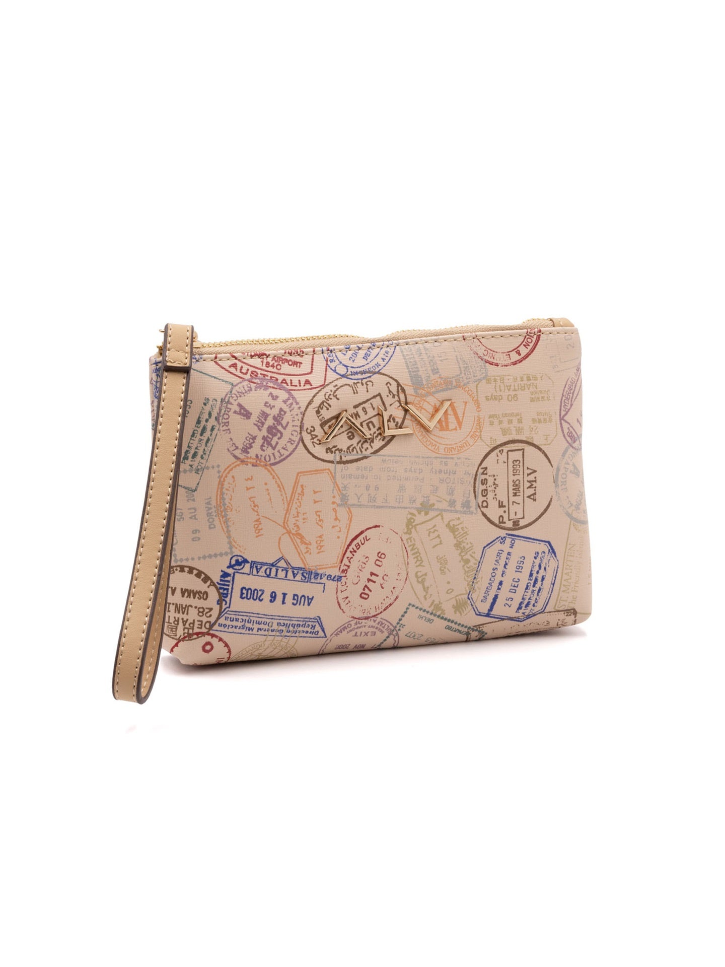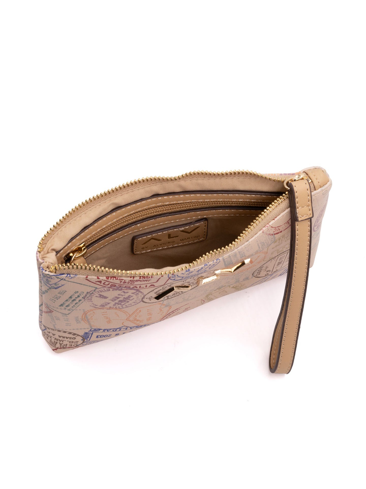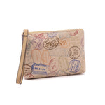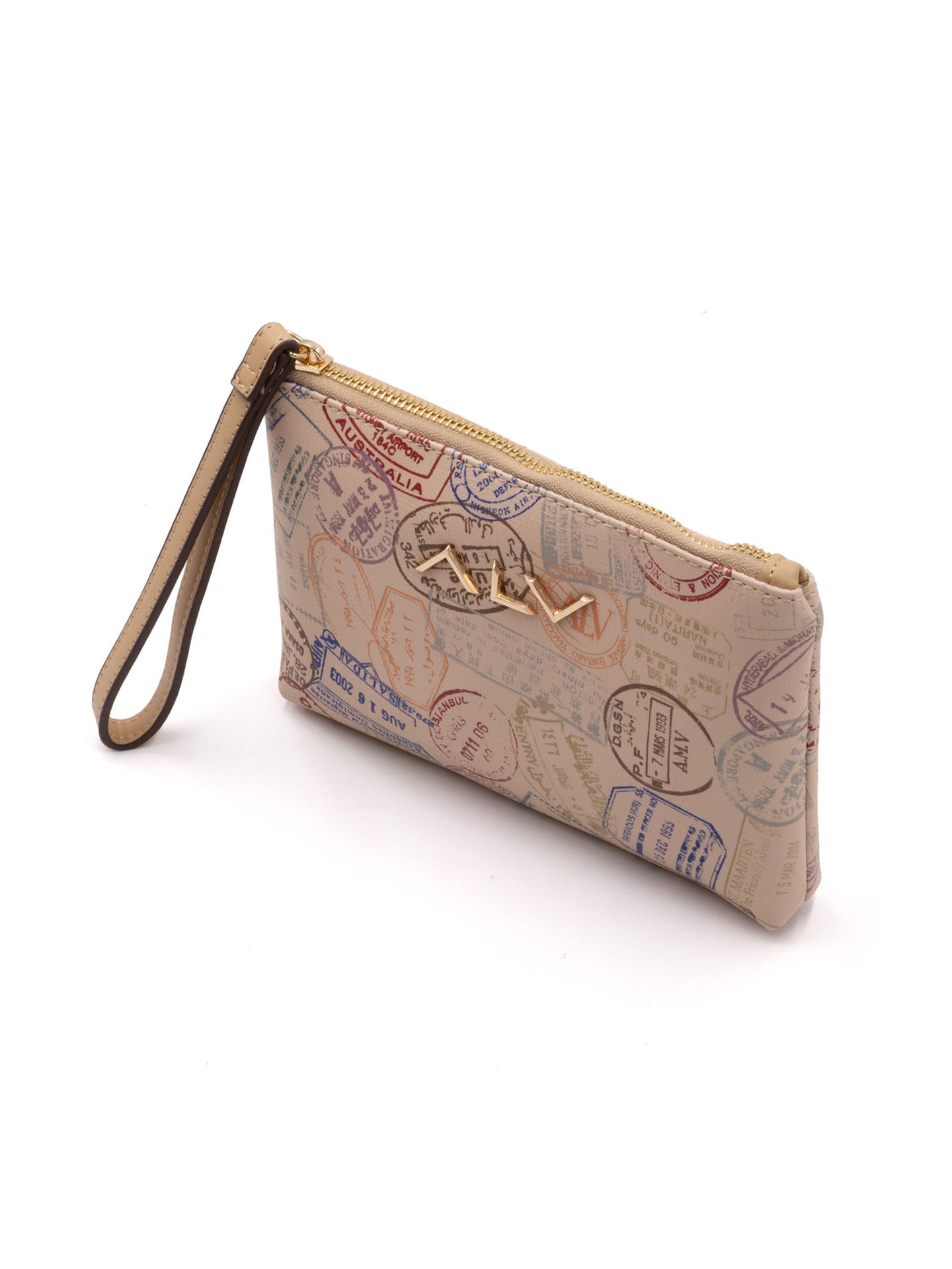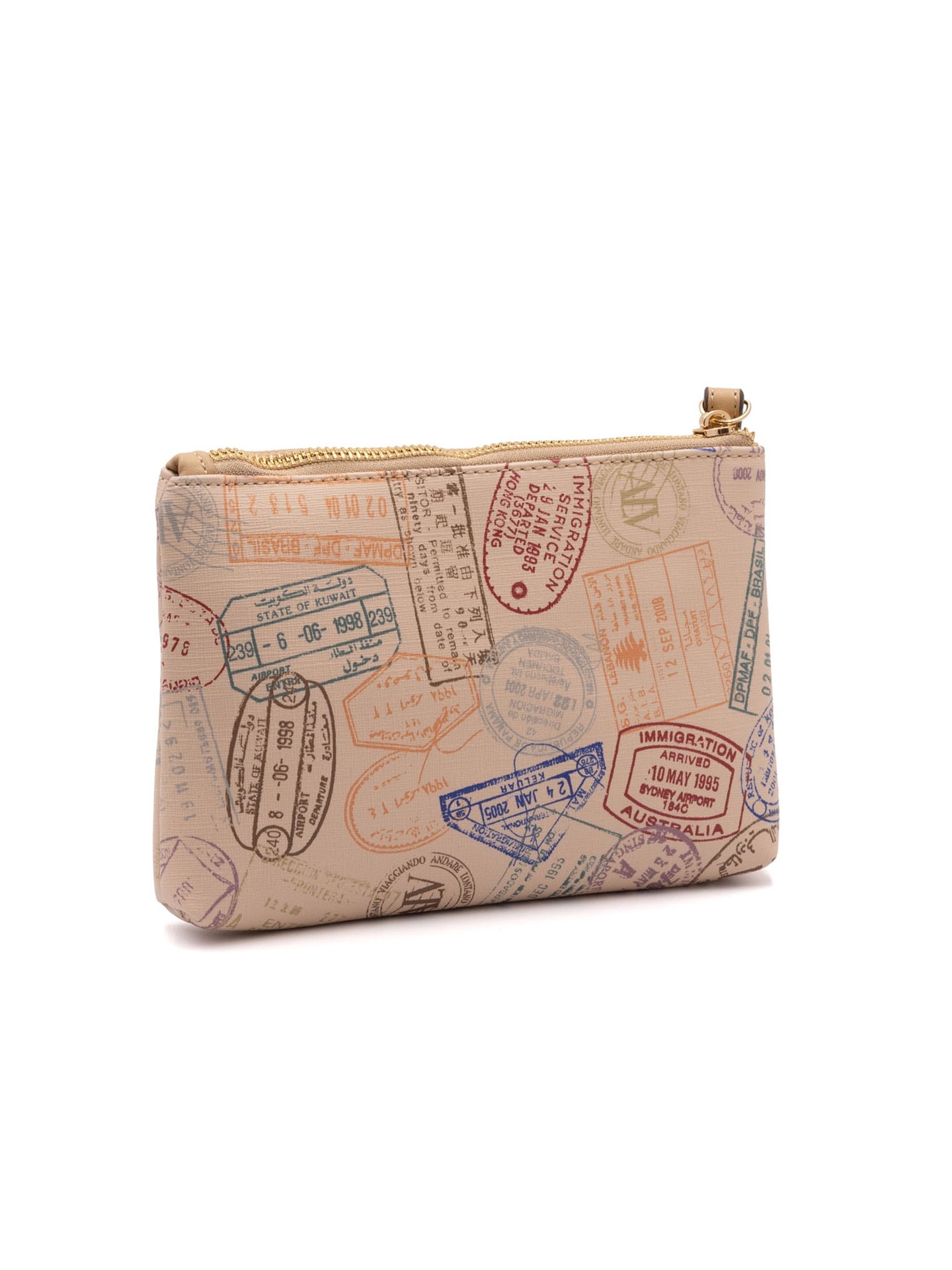 Un tocco di avventura e stile per il tuo look quotidiano. Questa pochette è l'accessorio perfetto per chi ama distinguersi con un tocco originale e ricercato. Realizzata in 100% poliuretano di alta qualità, la sua superficie è decorata con un affascinante motivo che ricorda i timbri di viaggio, evocando atmosfere esotiche e ricordi di avventure lontane.