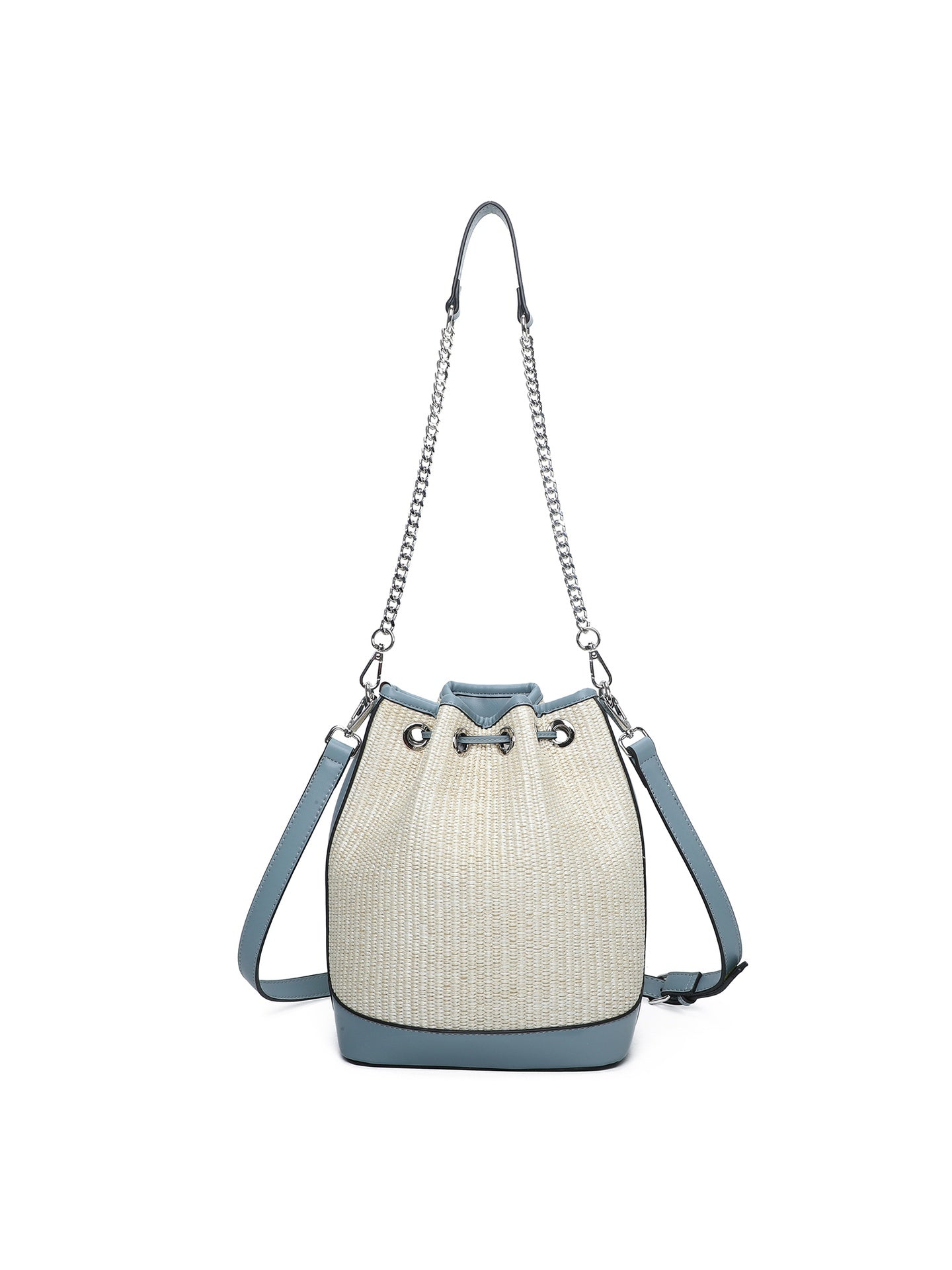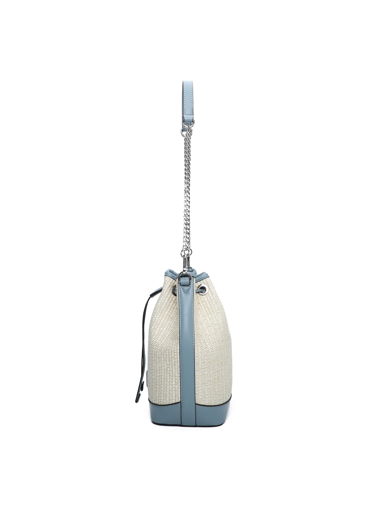 Il design a secchiello, con la sua chiusura a sacca, conferisce un tocco di originalità e permette di adattare lo spazio interno alle tue esigenze. L'interno foderato in poliestere garantisce protezione per i tuoi oggetti essenziali, mentre il dettaglio strutturato in carta contribuisce a mantenere la forma.