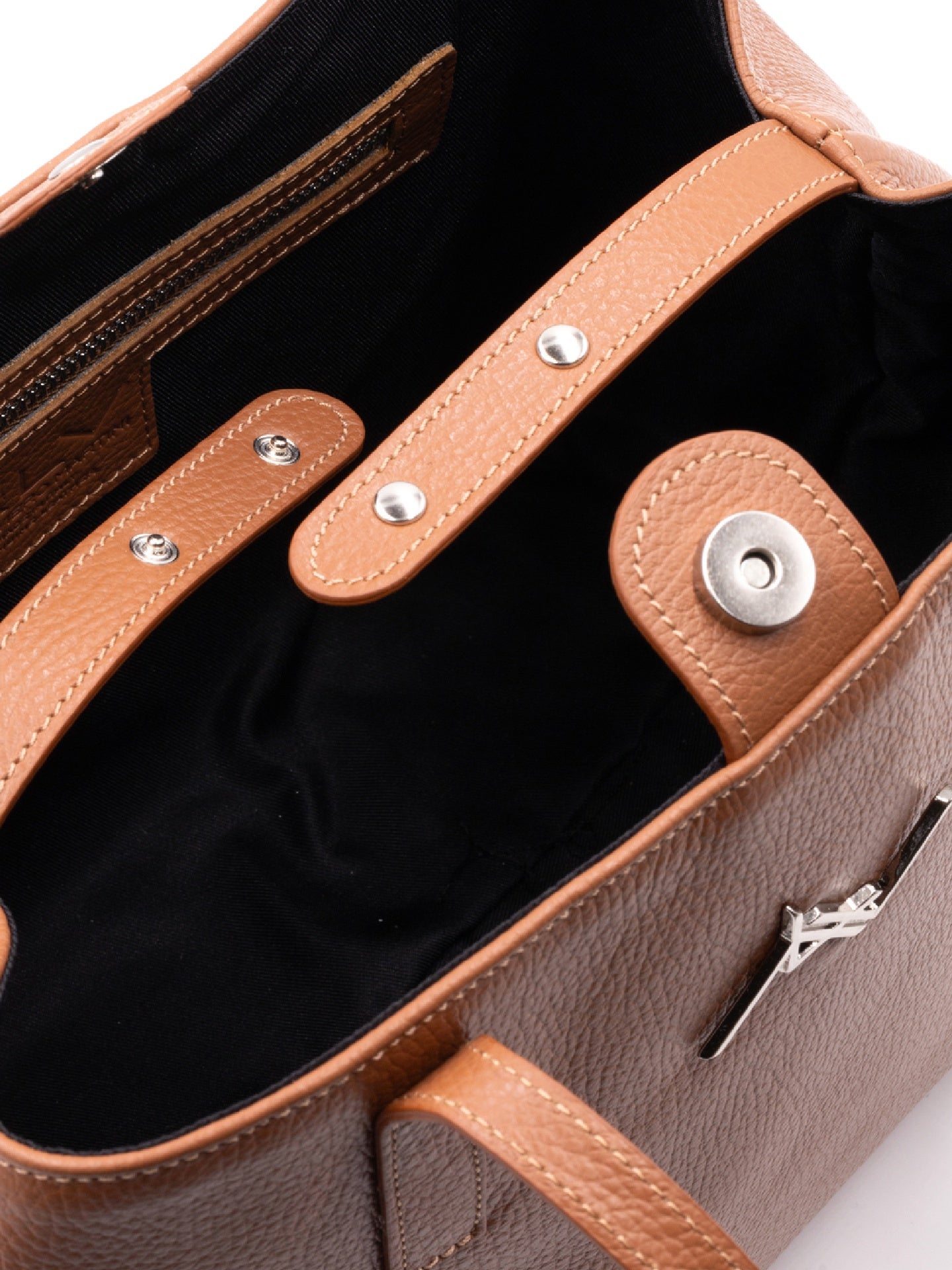 La pelle di alta qualità, morbida al tatto e resistente nel tempo, garantisce un'eleganza duratura. L'interno, foderato in poliestere resistente, offre un ambiente sicuro e pratico per tutti i tuoi effetti personali. La struttura interna, rinforzata con carta, mantiene la forma della borsa, anche quando è vuota.
