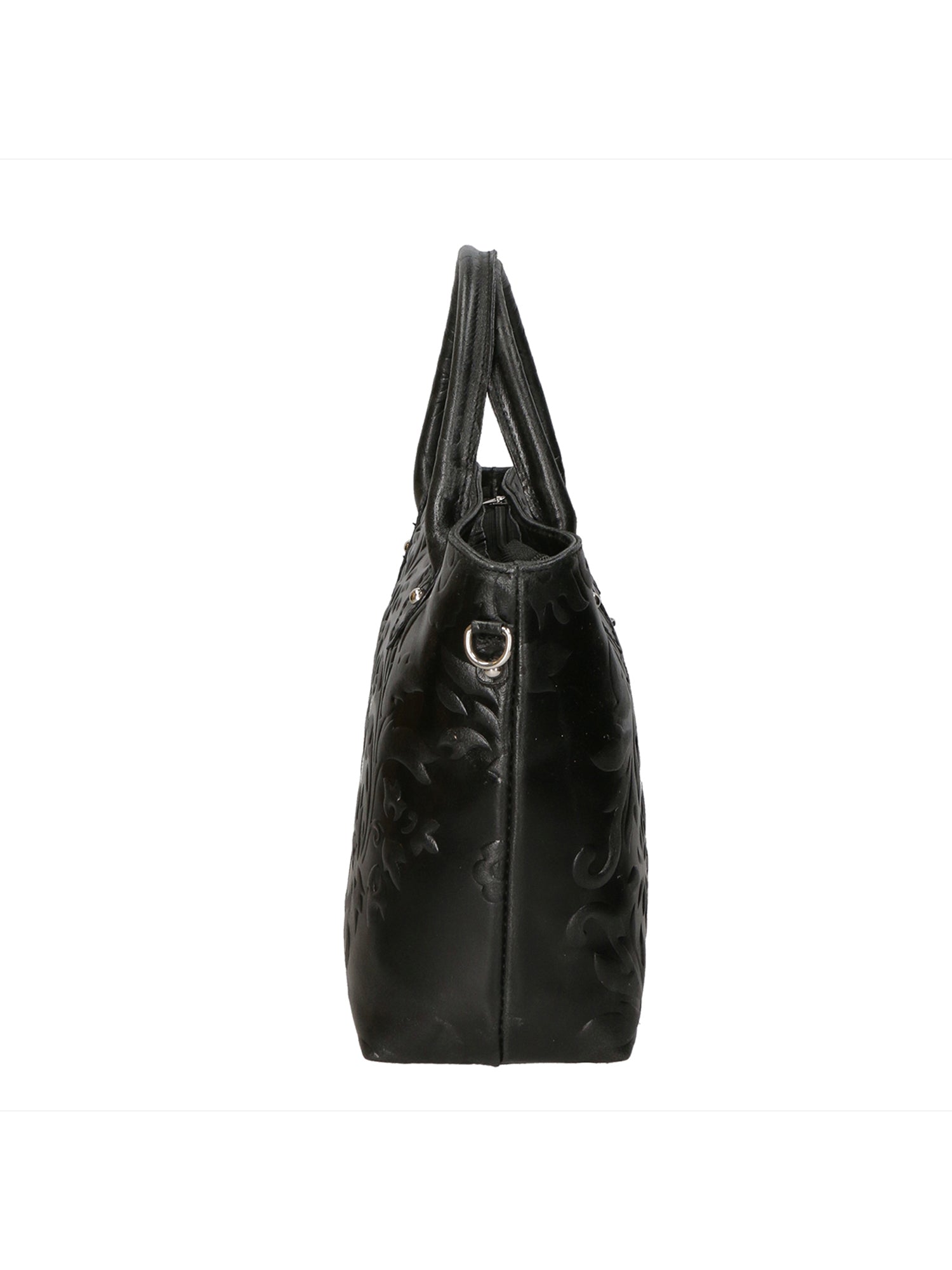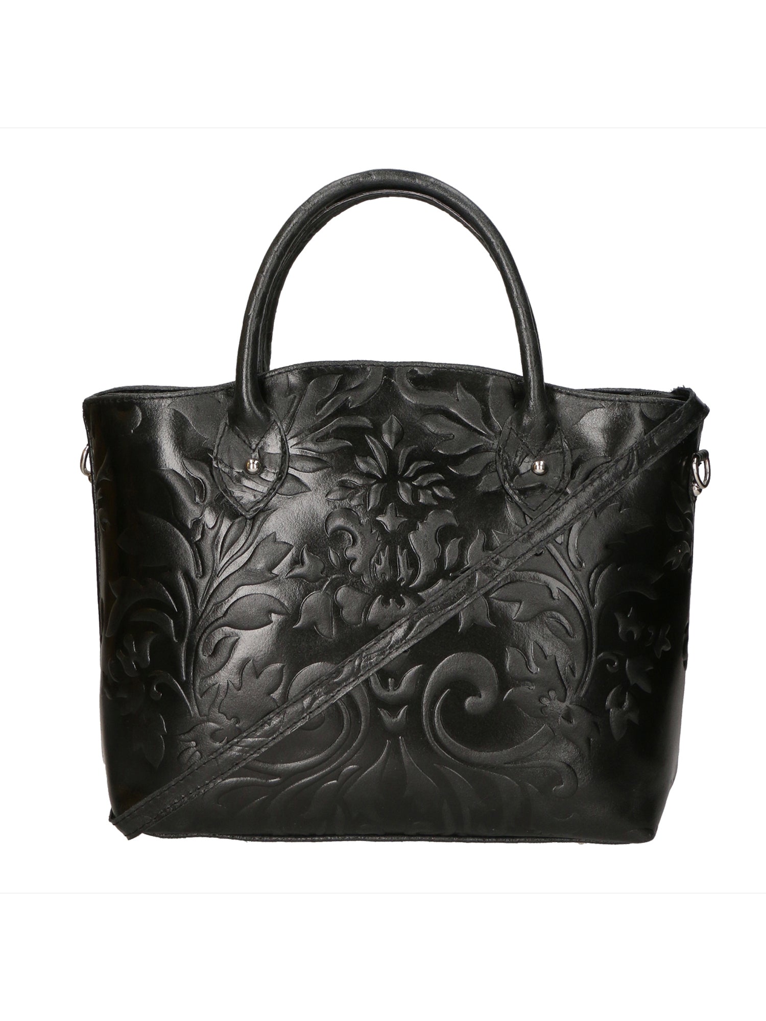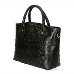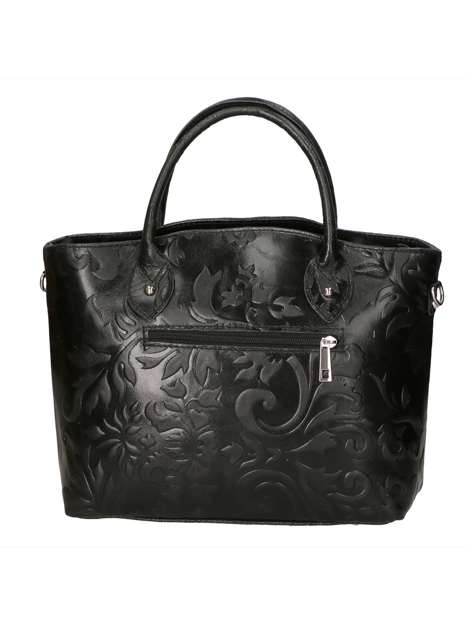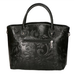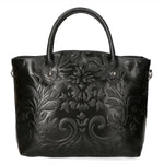 Borsa a mano a scomparto unico da donna con doppi manici, tasca posteriore con zip e tracolla rimovibile regolabile. Prodotto artigianale italiano in vera pelle camoscio stampato liscio con disegno floreale in rilievo. Made in Italy