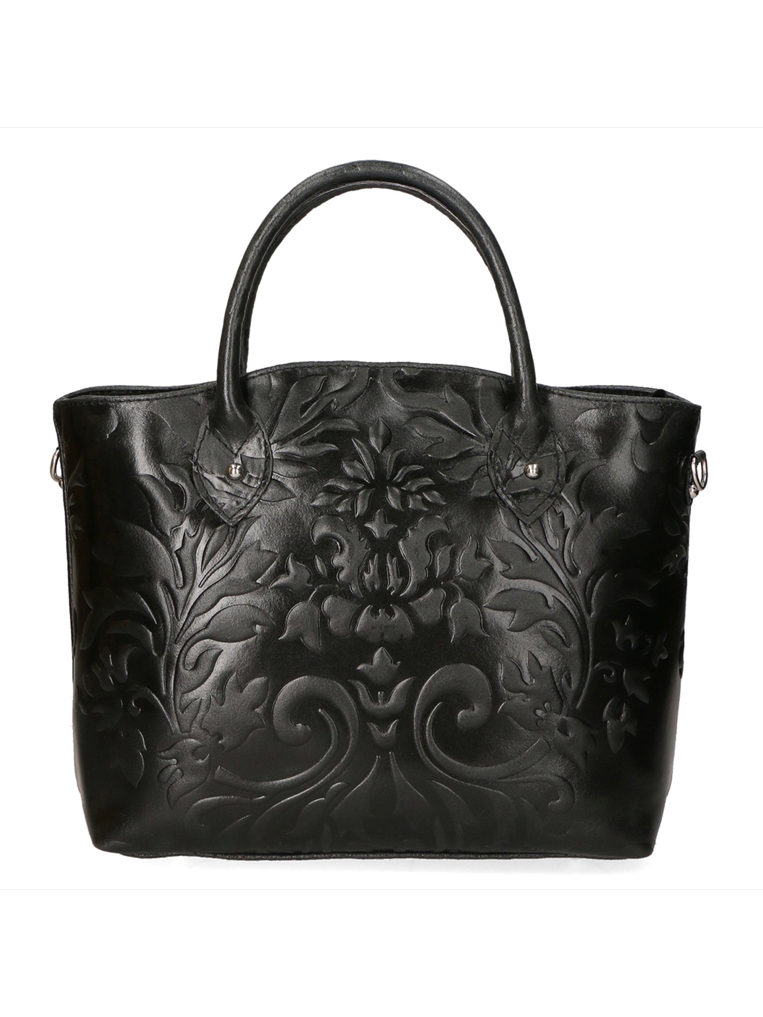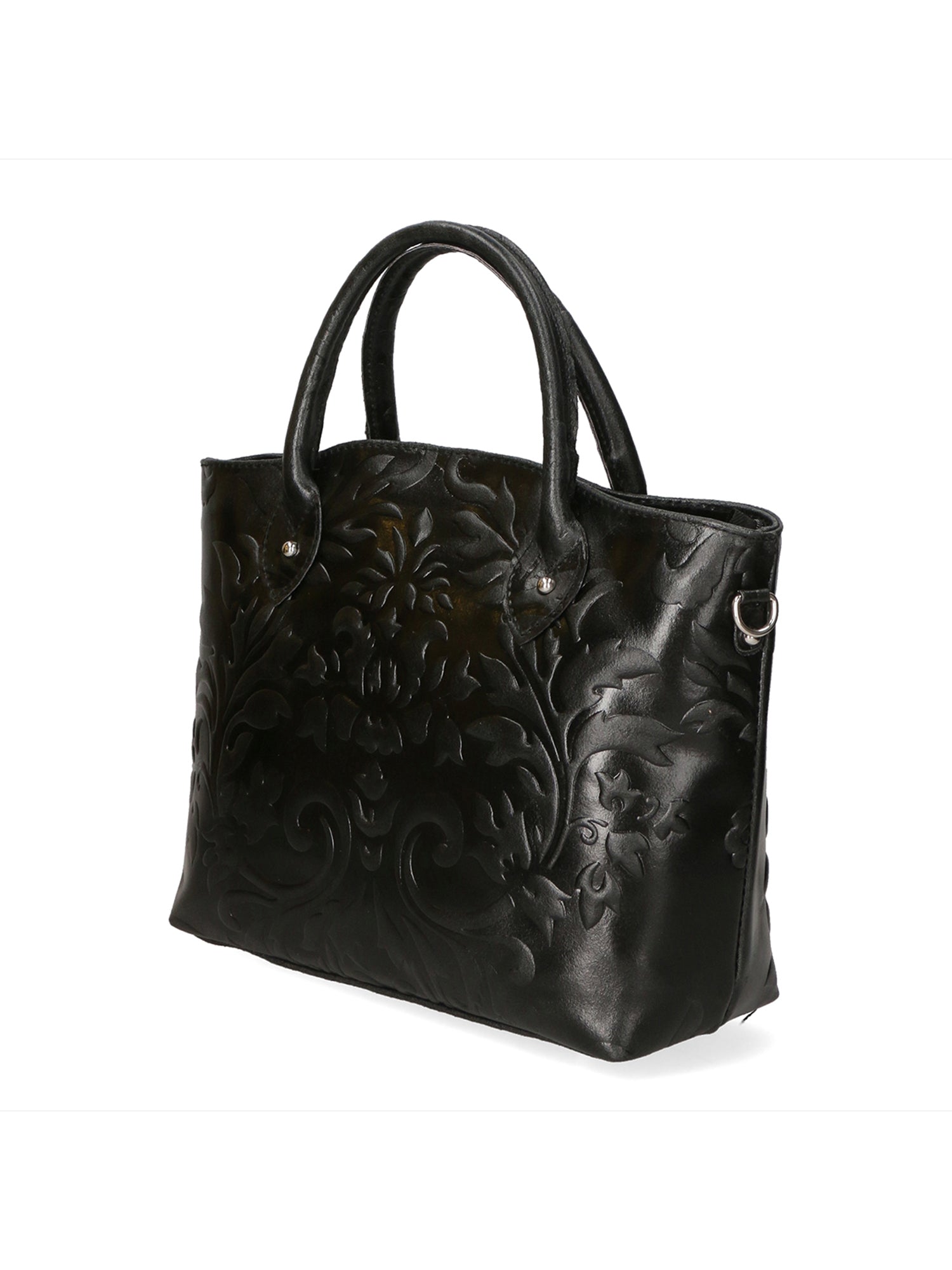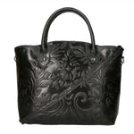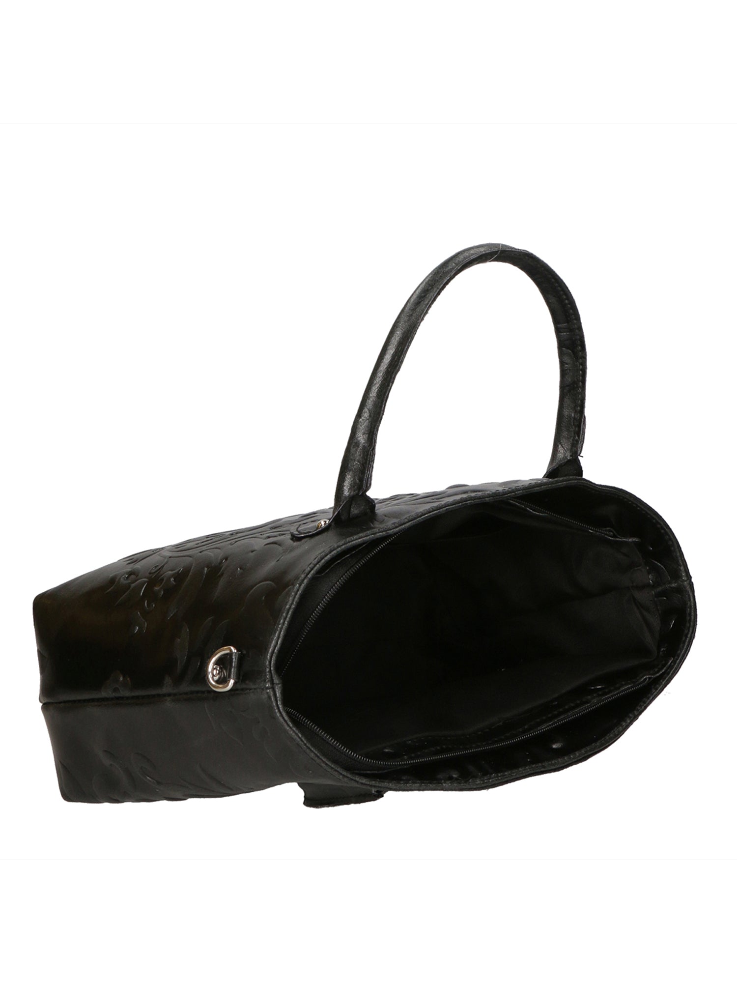 Borsa a mano a scomparto unico da donna con doppi manici, tasca posteriore con zip e tracolla rimovibile regolabile. Prodotto artigianale italiano in vera pelle camoscio stampato liscio con disegno floreale in rilievo. Made in Italy